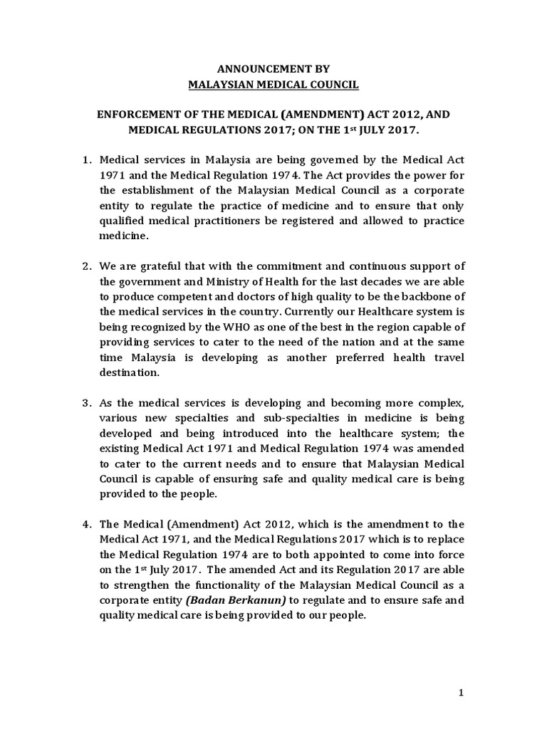The council became operational in february, 1988. The medical council of malta is the regulatory body for the registration and regulation of doctors and dentist (only) in malta. The act provides for the malaysian medical council to establish evaluation committees under section 4e of the medical (amendment 2012) act 1971 and regulation 23, medical regulation 2017 for the purpose of evaluation and registration of medical practitioners. Out network is made up of malaysian medical students throughout the globe. The medical act 1971 (the act) provides for 33 members to represent medical practitioners throughout malaysia from various sectors including the public sector and the private sector within the malaysian medical council (mmc).