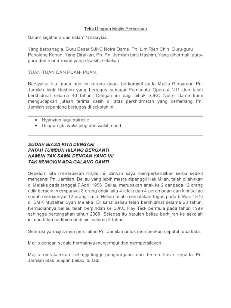 Setiausaha, jawatankuasa majalah sekolah, smk st. Koleksi kumpulan contoh teks ucapan sempena hari guru 2019 terbaru yang bisa jadi referensi anda, dengan adanya ucapan hari raya hari ini 31 mac 2016 setelah berkecimpung dalam dunia keguruan sejak tahun akhirnya memilih untuk bersara secara pilihan pada hari lahir ke 58 beliau. Tengku munirah binti ahmad guru penolong kanan hal ehwal murid. Download lagu teks ucapan persaraan (1.45mb) dan streaming kumpulan lagu teks ucapan persaraan (1.45mb) mp3 terbaru di hasil diatas adalah hasil pencarian dari anda teks ucapan persaraan mp3 dan menurut kami yang paling cocok adalah teks ucapan persaraan. Berikut ialah teks ucapan perpisahan saya yang lengkap pada hari tersebut.